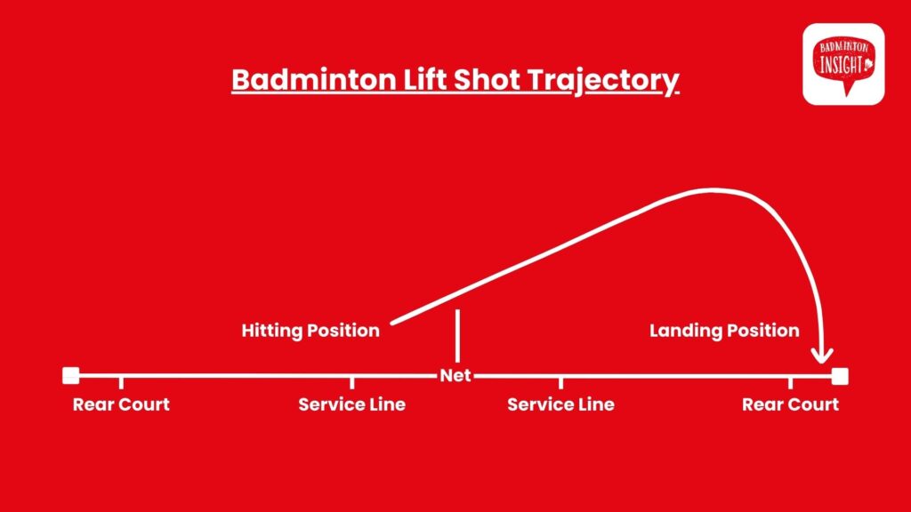 The badminton lift shot is played from the front of the court on one side to the back of the court on the other side, with an upwards trajectory. It is often played to reset the rally or to move the opponent.
