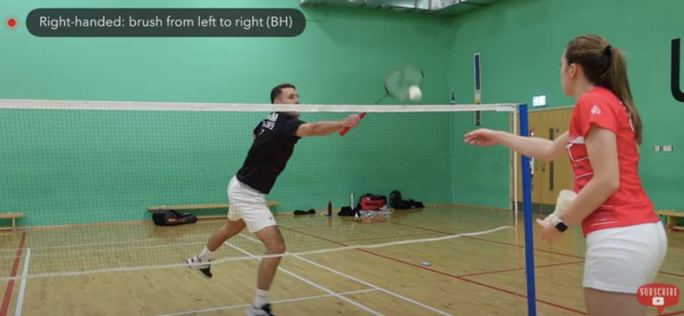 Here you need an even shorter swing and to hit the shuttle with less power, so that is lands around the service line (what we call a brush off – you are trying to gently brush the top of the shuttle so it travels downwards and over the net)