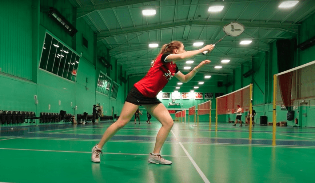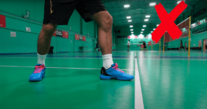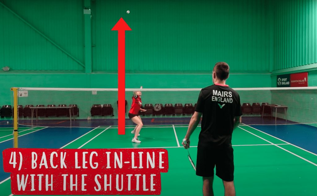 At this point, you will start your swing. Ideally, you want to have your back leg roughly in line with the shuttle, and this leg will then push off the floor, initiating a scissor kick.