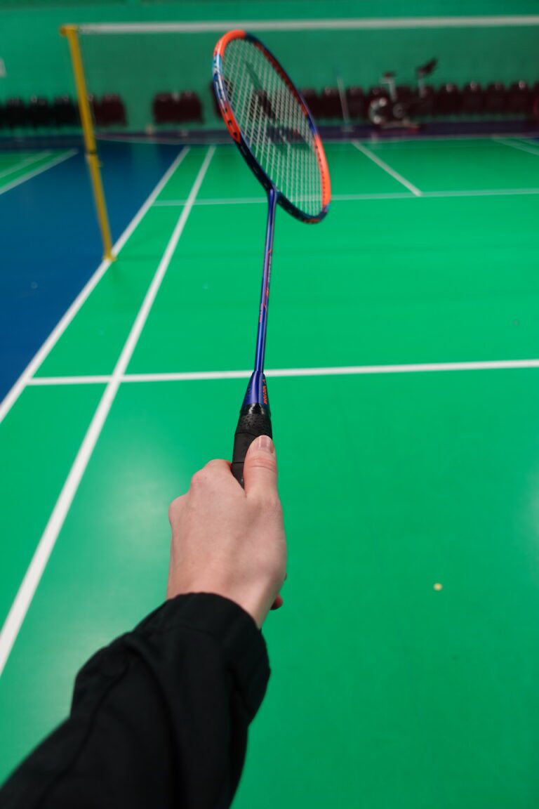 Your racket should be in a relaxed but ready position and out in front of you so that your elbow isn’t tucked in. This is to help you take the shuttle earlier. You don’t want your arm fully extended as you won’t be able to adjust as quickly to the serve!