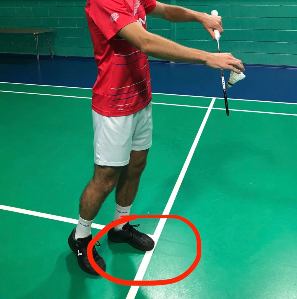 As you strike the shuttle, part of both feet must be in contact with the ground. You cannot move or lift either foot off the ground until the serve has been struck.